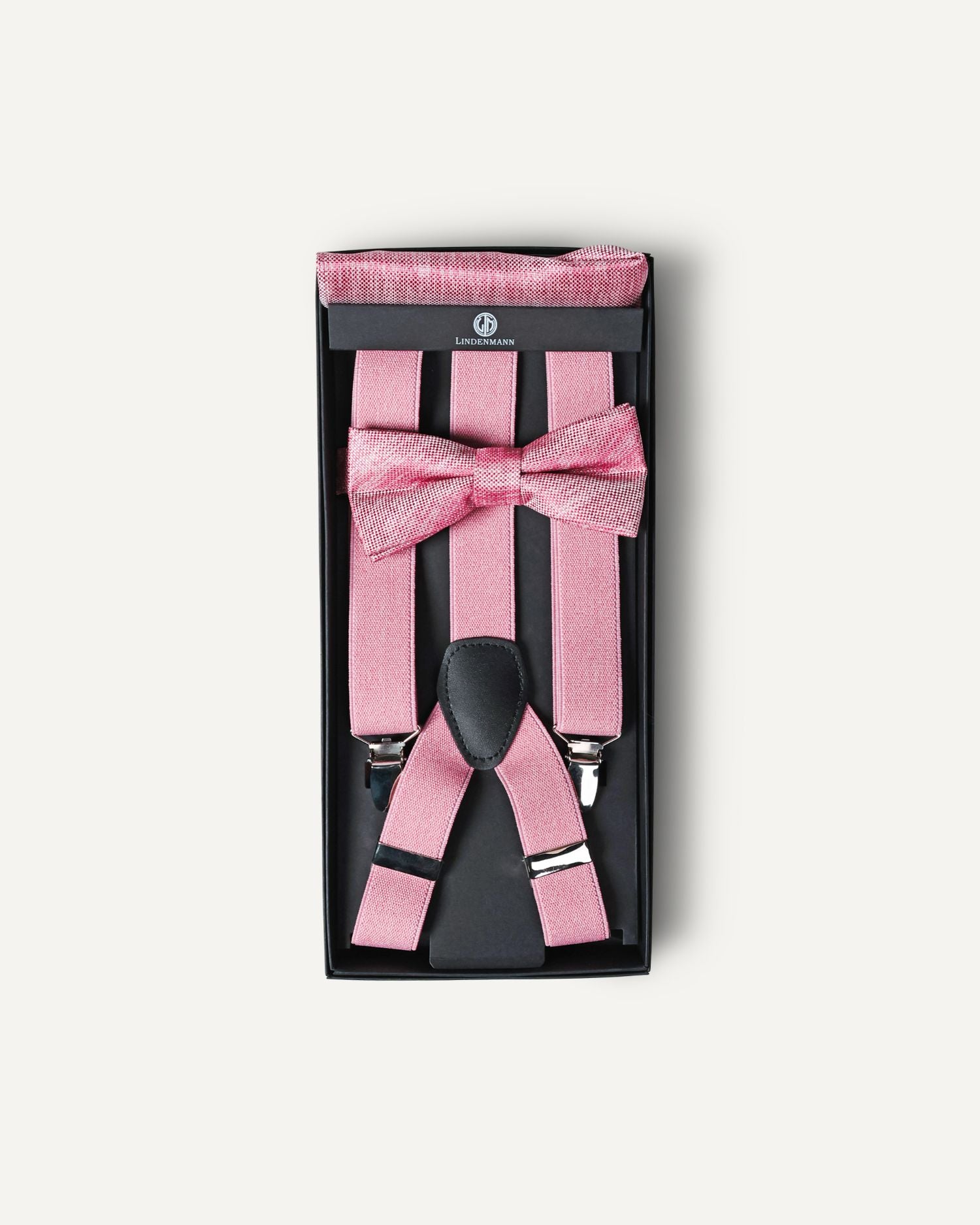 - Kombination aus Hosenträger + Fliege + Einstecktuch in der selben Farbe und selben Muster